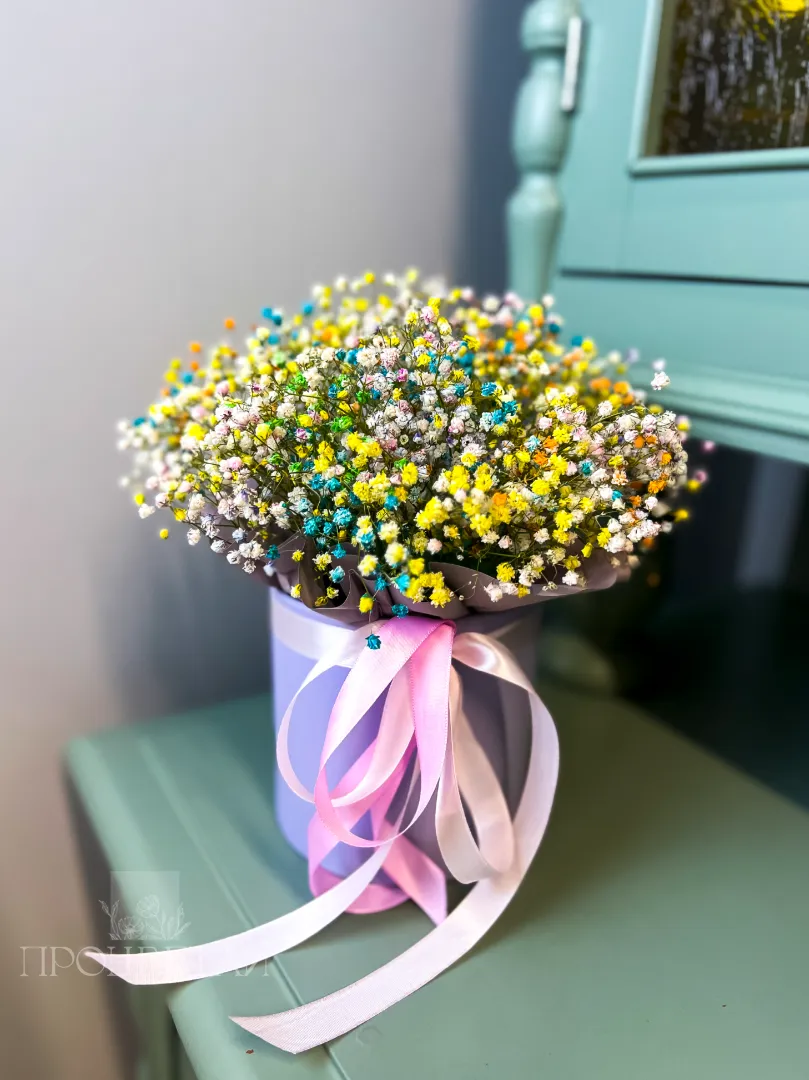 Такой букет в шляпной коробке можно преподнести в знак восхищения и любви.